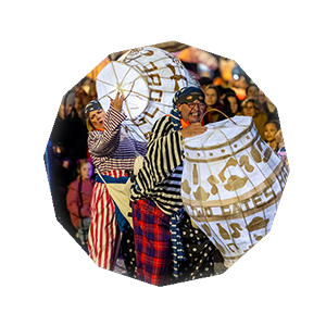 Families made stunning lanterns over a week of workshops in The Watershed, on the theme of SHOP! Local schools decorated illuminated barrels for the event. Local scouts also made lanterns for the event. Refugee charity 6 Million Plus created a moon lantern which was floated on the canal in the lead up to events and part of the parade.